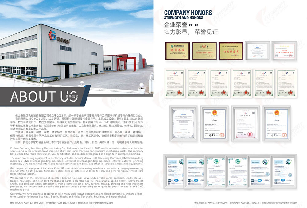 Foshan Ruizheng Machinery Manufacturing Co., Ltd. is a service-oriented enterprise specializing in the production of precision shaft parts and precision non-mechanical parts. It has passed ISO-9001 certification and SGS certification, and has been awarded the title of China High-tech Enterprise. Our factory has more than 70 advanced precision machining equipment and testing equipment, and has an experienced professional technical team. At present, we have business cooperation with many well-known enterprises and listed companies, and are long-term suppliers of Hitachi, Bosch, Haas, Midea (shafts, housings, motor shafts).
